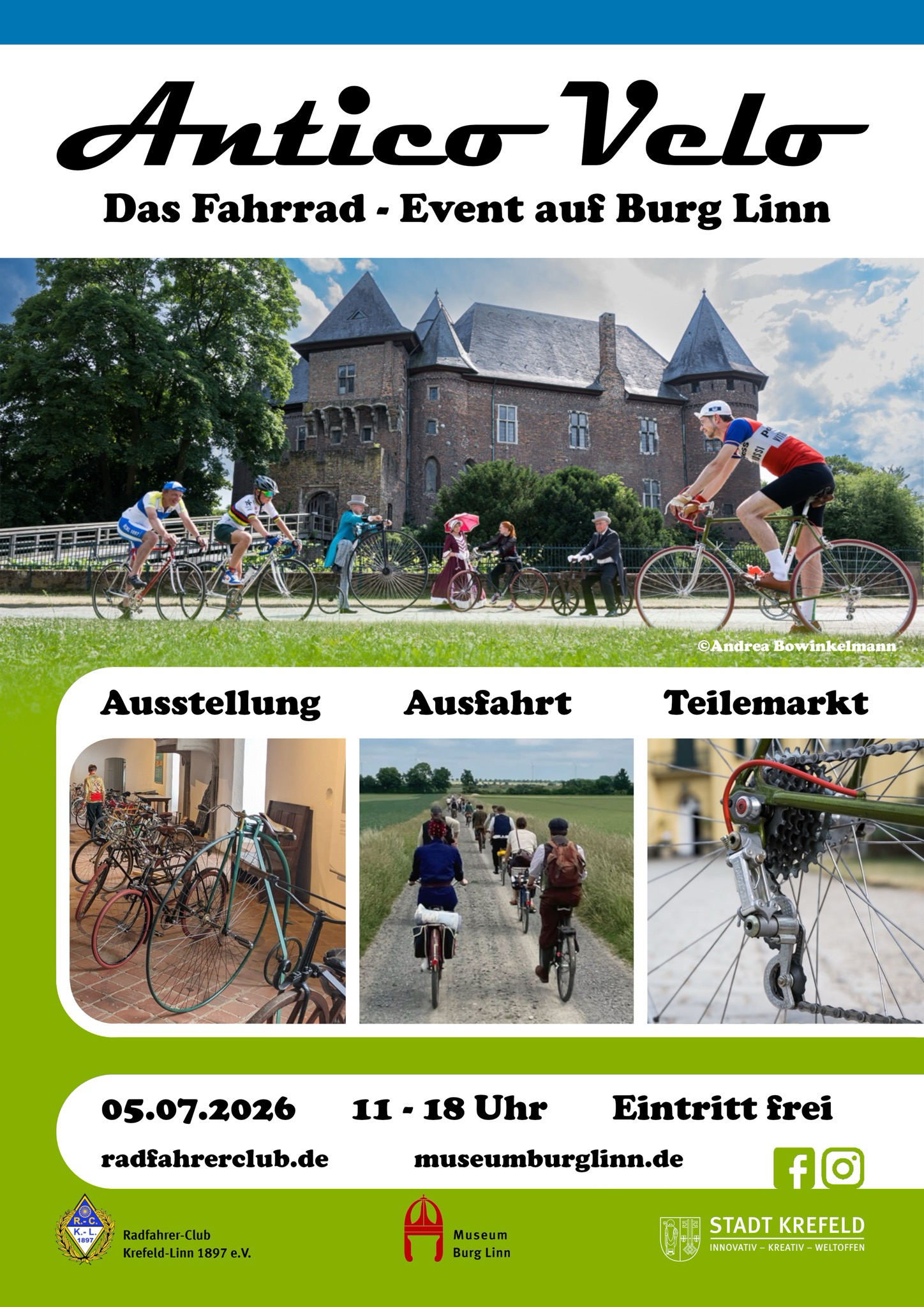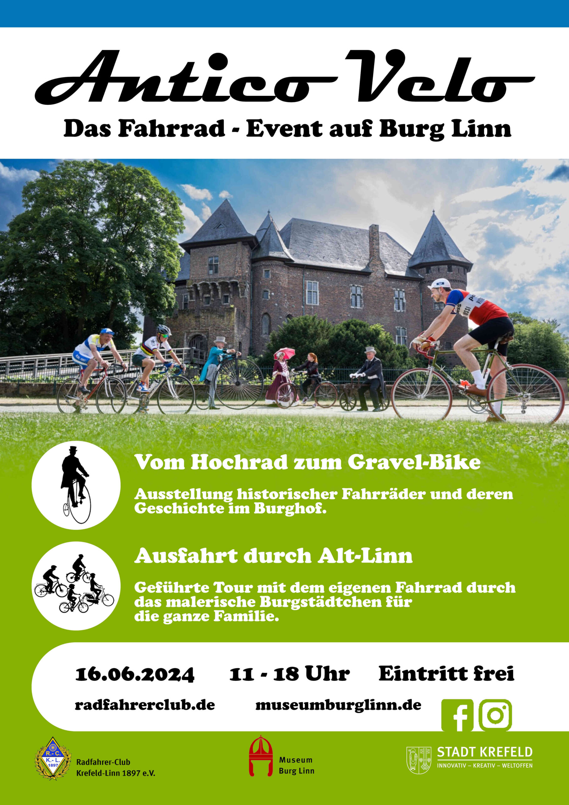 Der Radfahrer-Club Krefeld-Linn 1897 e.V. veranstaltet, als ältester Radsportverein der Stadt Krefeld, zusammen mit dem Museum Burg Linn die Antico Velo – Das Fahrrad-Event auf Burg Linn.